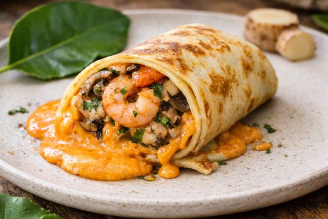 Как приготовить: Креветки быстро обжарьте с рубленым чесноком (буквально 2 минуты). Авокадо нарежьте кубиком и обильно полейте соком лайма. Смешайте креветки с авокадо и сразу заворачивайте.