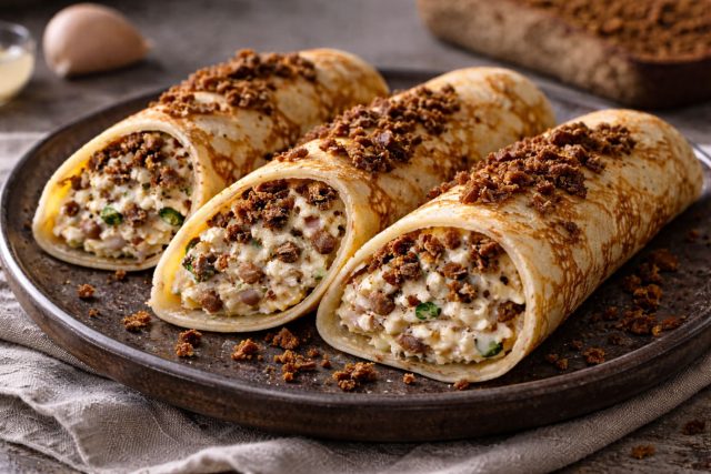 Очень калорийная и яркая начинка с кремовой текстурой перемолотого сала, которую пронзает острота свежего чеснока. Крошки бородинского хлеба здесь не только для вкуса — они приятно похрустывают на зубах, создавая интересную игру текстур внутри мягкого блина.