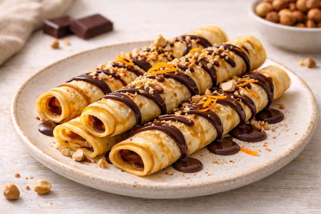 Как приготовить: Растопите шоколад на водяной бане или в микроволновке. Вмешайте в него цукаты и дробленые орехи. Добавьте совсем немного чили. Намажьте на блин тонким слоем и скрутите в трубочку. Для украшения используйте остатки шоколада (пролейте тонкой струйкой и поставьте на 5-15 минут в холодильник, чтобы шоколад схватился), апельсиновые цукаты и дроблённые орешки.