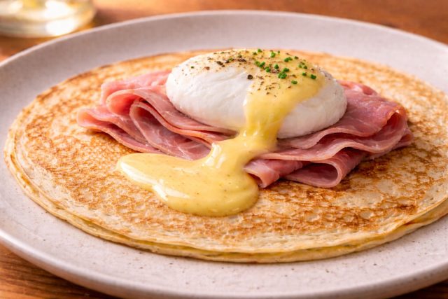 Как приготовить: Сварите яйца пашот так, чтобы белок схватился, а желток остался жидким. В центр блина положите ломтик ветчины. Края блина подверните квадратом к центру, создавая «бортики», но оставляя середину открытой. Аккуратно выложите яйцо пашот на ветчину. Полейте голландским соусом сверху (лучше ложкой, чтобы он не растекся) и посыпьте свежей зеленью и перцем.