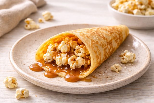 Игра контрастов: мягкое, теплое тесто блина и сухой, хрустящий попкорн внутри. Тягучая соленая карамель связывает всё вместе, создавая во рту ощущение настоящего кинотеатра. Главное — есть быстро, пока попкорн сохраняет свою воздушную текстуру.
