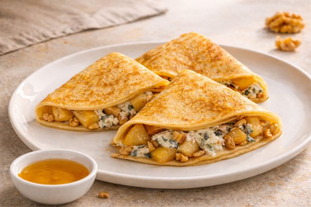 Как приготовить: Грушу нарежьте кубиком и обжарьте на сковороде с сахаром и лимоном 3–5 минут до мягкости. Выложите на блин, посыпьте раскрошенным сыром и орехами. Сворачивайте сразу, чтобы сыр начал таять от тепла груши.