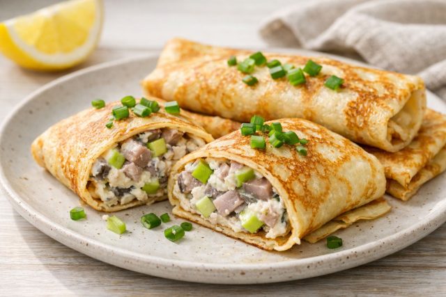 Сытный и плотный вариант, где знакомый вкус салата становится более теплым и домашним благодаря блинной оболочке. Мелкая нарезка ингредиентов здесь критически важна: начинка получается однородной, легко жуется и пропитывается соусом, не выпадая кусками при укусе.