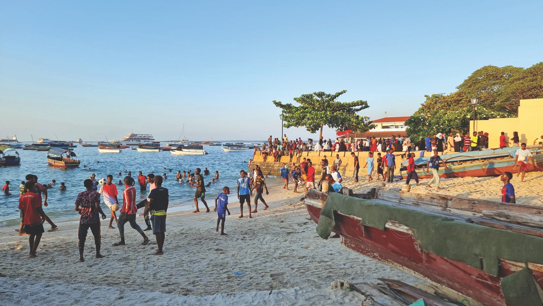 Но Стоун-Таун – не столько про отдельные достопримечательности, сколько про уникальную атмосферу, одновременно отсылающую к арабской сказке и мифам народов Африки. Про лабиринт тесных улочек, по которым наперегонки с туристами снуют морской бриз и запахи экзотичес-ких специй. Про массивные двери с искусной ажурной резьбой и острыми шипами – гиды учат различать их стили и подмечать характерные особенности. Про длинную и всегда оживлённую набережную с высоченными, шелестящими на ветру пальмами, покачивающимися на волнах туристическими лодчонками и стайками мальчишек, с разбегу – и под аплодисменты окружающих – ныряющих в тёплые океанские воды.