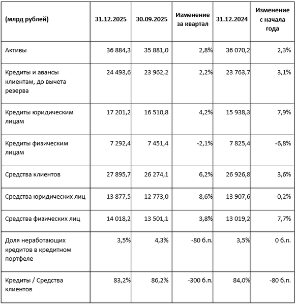 По итогам 2025 года совокупные средства клиентов Группы увеличились на 3,6% до 27,9 трлн рублей (с учетом корректировки на эффект валютной переоценки рост составил 6,0%), при этом за четвертый квартал 2025 года рост составил 6,2% (с учетом корректировки на эффект валютной переоценки рост составил 6,7%). В течение года в структуре клиентских привлечений происходило постепенное замещение корпоративного фондирования розничным.