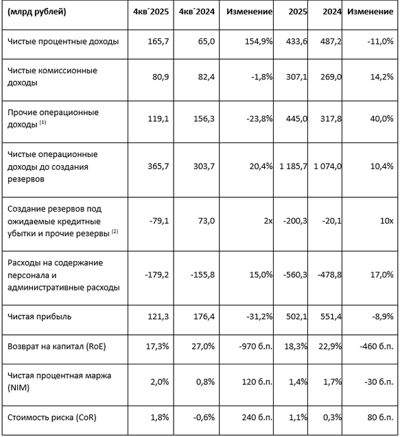 (1) Без учета убытка после налогообложения, полученного от дочерних компаний, приобретенных исключительно для перепродажи в сумме -1,4 за 4 квартал 2025 года и -2,0 за 12 месяцев 2025 года.(2) Включает расходы на создание резерва под ожидаемые кредитные убытки по долговым финансовым активам; создание резерва под кредитные убытки по обязательствам кредитного характера, и прочим финансовым активам, создание резерва под судебные иски и прочие обязательства.