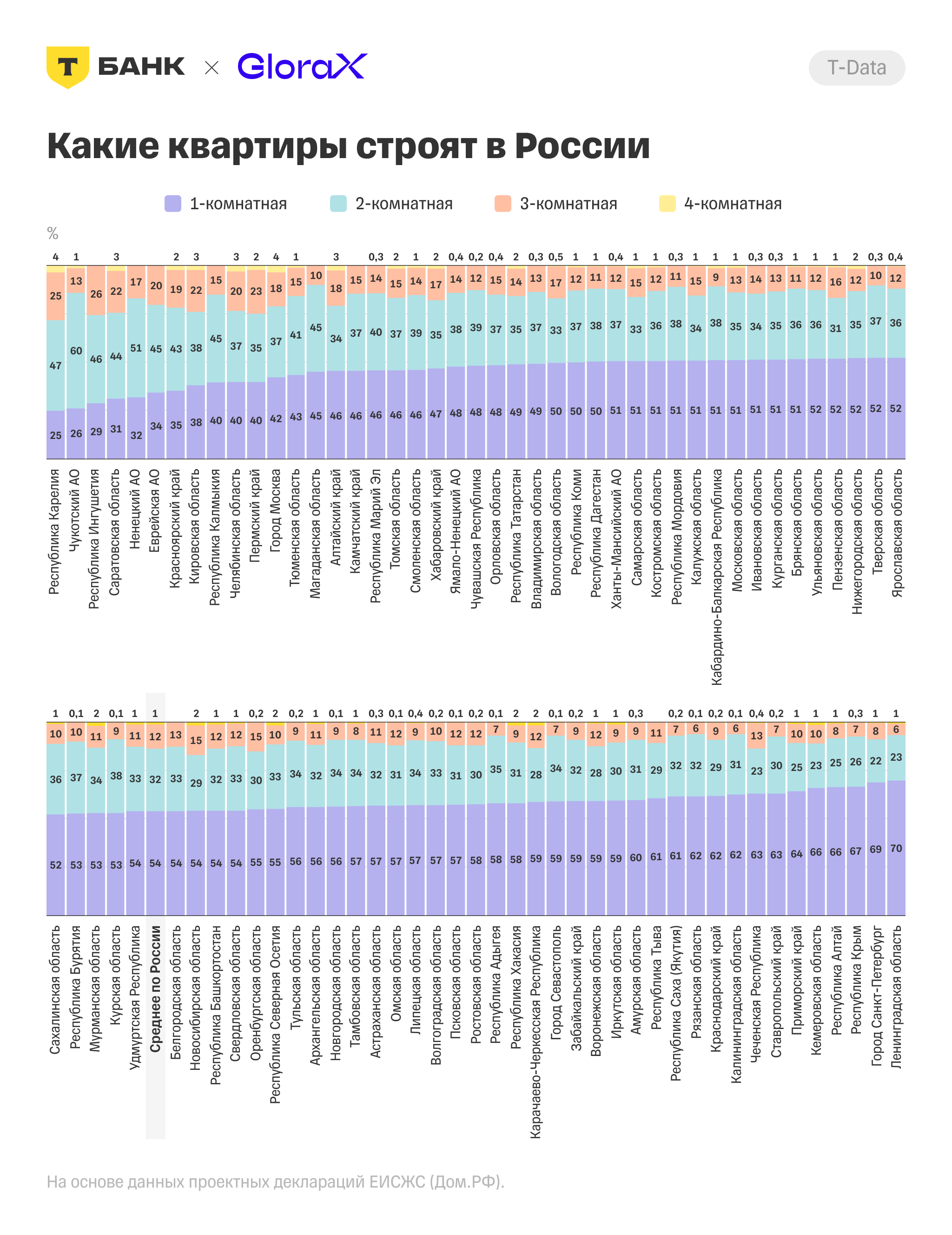Региональная картина только усиливает тренд. В Ленинградской области и Санкт-Петербурге доля студий и однокомнатных квартир достигает 69–70%. Это не про комфорт — это про адаптацию к цене.